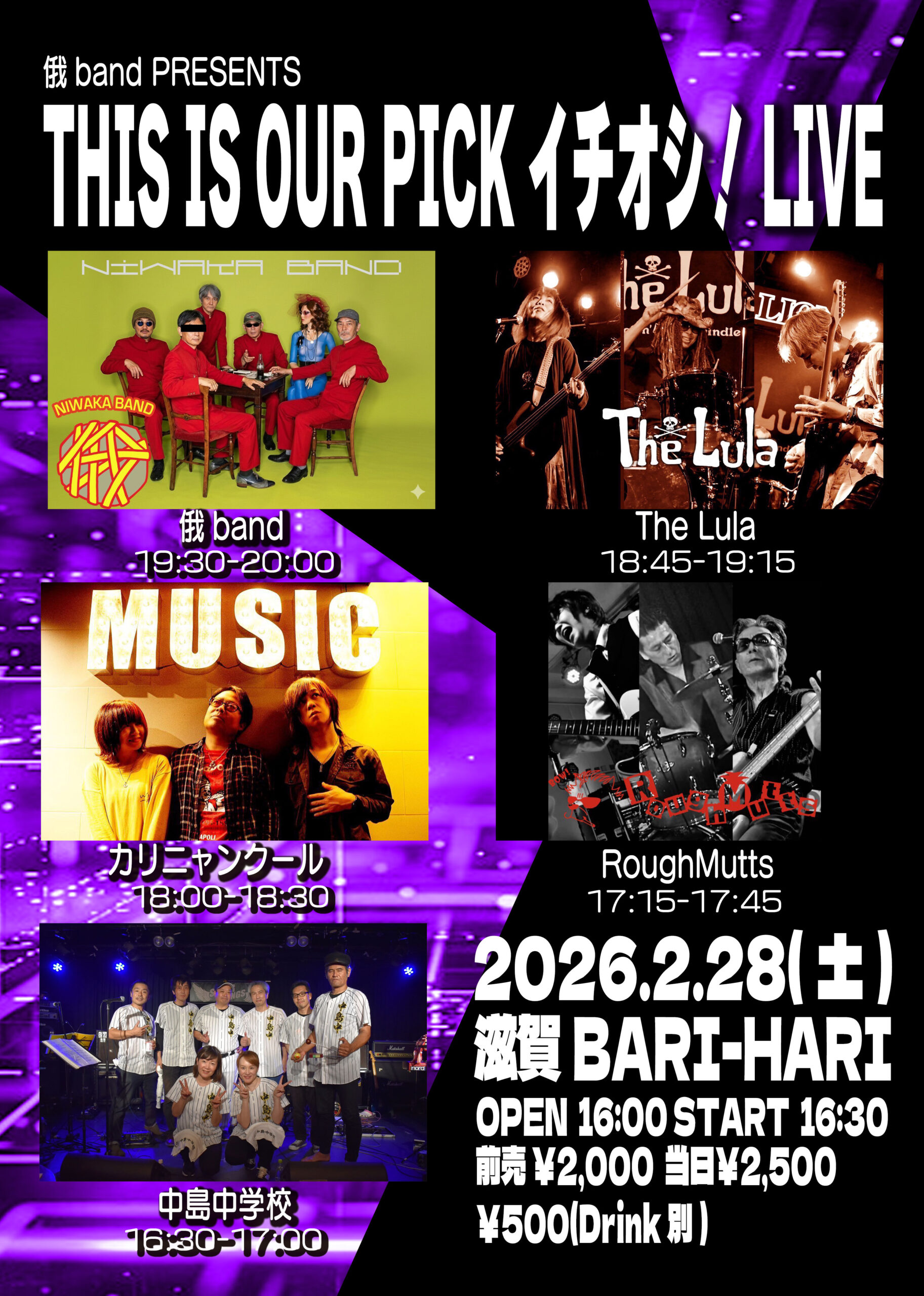2/28(土) 野洲バリハリにて俄band主催にてライブイベントを行います。